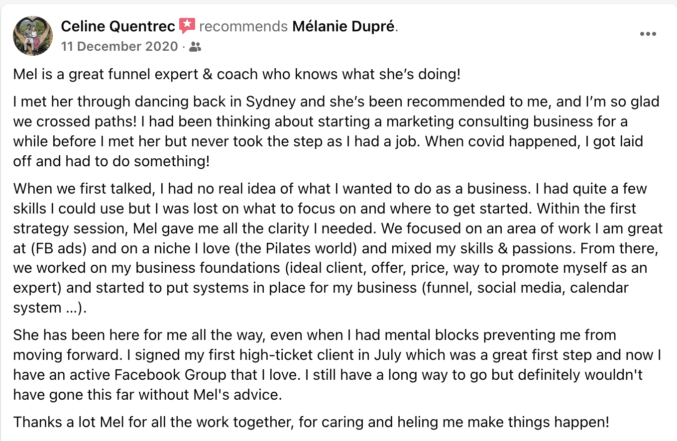 We all need more leads, we all need consistent income and she created a really killer funnel strategy which was able to provide just that so I can focus more on delivering and providing the service inside my business and doing less of the internet marketing lead generation."