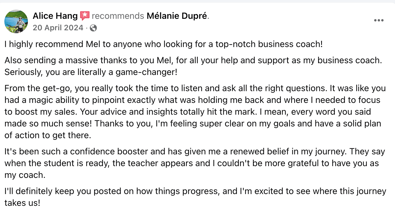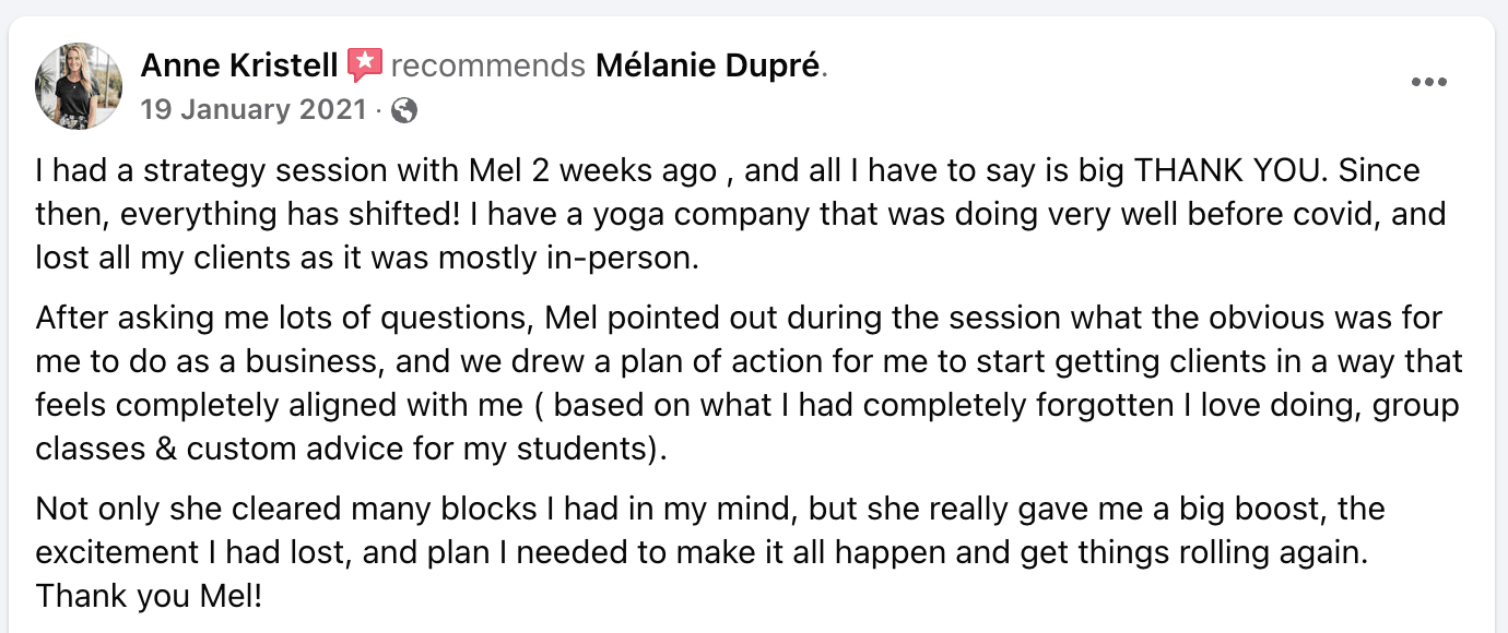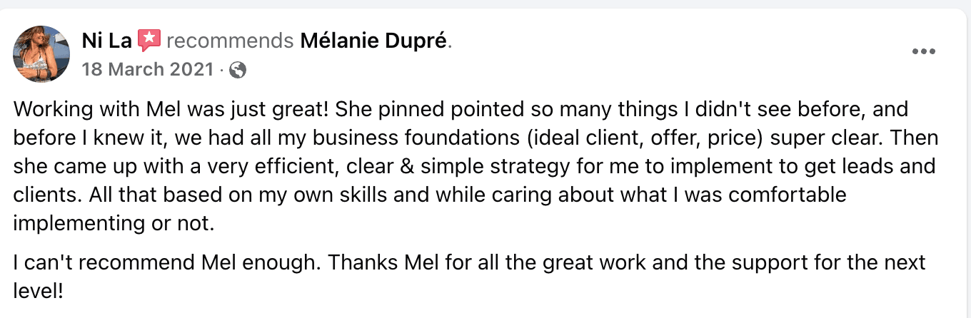 "Mel has a creative and strategic mind, she was able to ask all the right questions to get a really good understanding of what's happening inside my business.